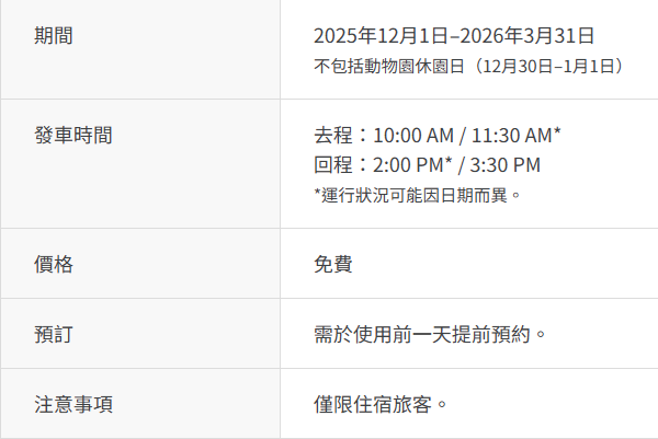 這次入住OMO7旭川by 星野集團,入住者可以使用飯店提供的免費接駁巴士前往旭山動物園,在使用前一天預約即可,去程與回程有2個時間段可以選,若要看11點的企鵝散步建議是搭10點出發的接駁車。
