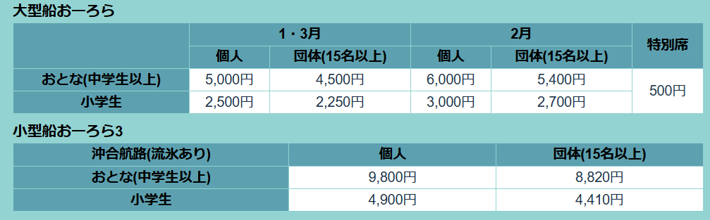 網走「AURORA極光號」從11月從官網已經可以開始預約2026年的破冰船,看了價格跟去年相比漲了蠻多的,依照月分價格有所不同,從5,000日幣起~,大型船運行期間大約1小時而3月份限定的小型船則是運行2個小時。