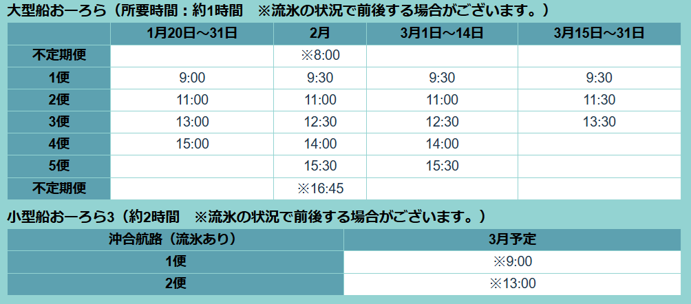 一般來說最能看到流冰的時期在2月中旬到3月上旬,有些地區早一點在1月下旬就能觀測到流冰。只是近年來受到地球暖化影響,能觀測到流冰的時期越來越短了。