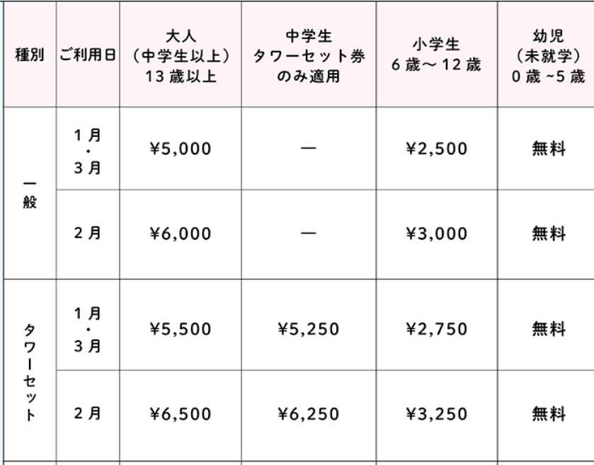 票價:成人5,000日幣~,小學生以下2,500日幣,5歲以下免費。