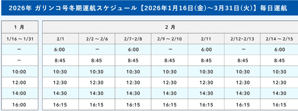 運航時間:2026年1月16日~3月31日(每年略有不同請依官網為準),一日4~5班