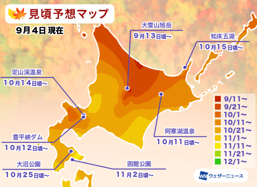札幌以往賞楓時期落在10月中到11月初,這時期來札幌是最有可能看到最美的楓葉。但近年來氣候變遷年年都變得晚一些,2025年9月4日由Weathernews公布的最佳賞楓時期,札幌紅葉最佳賞楓是預估在11月初。