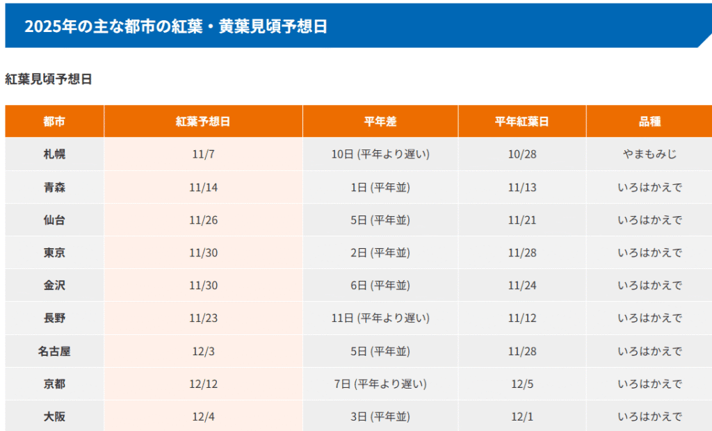 若想要知道更確切的賞楓日期,可關注日本賞楓預測的網站,以下為日本氣象株式會社預測的各個城市紅葉日期。